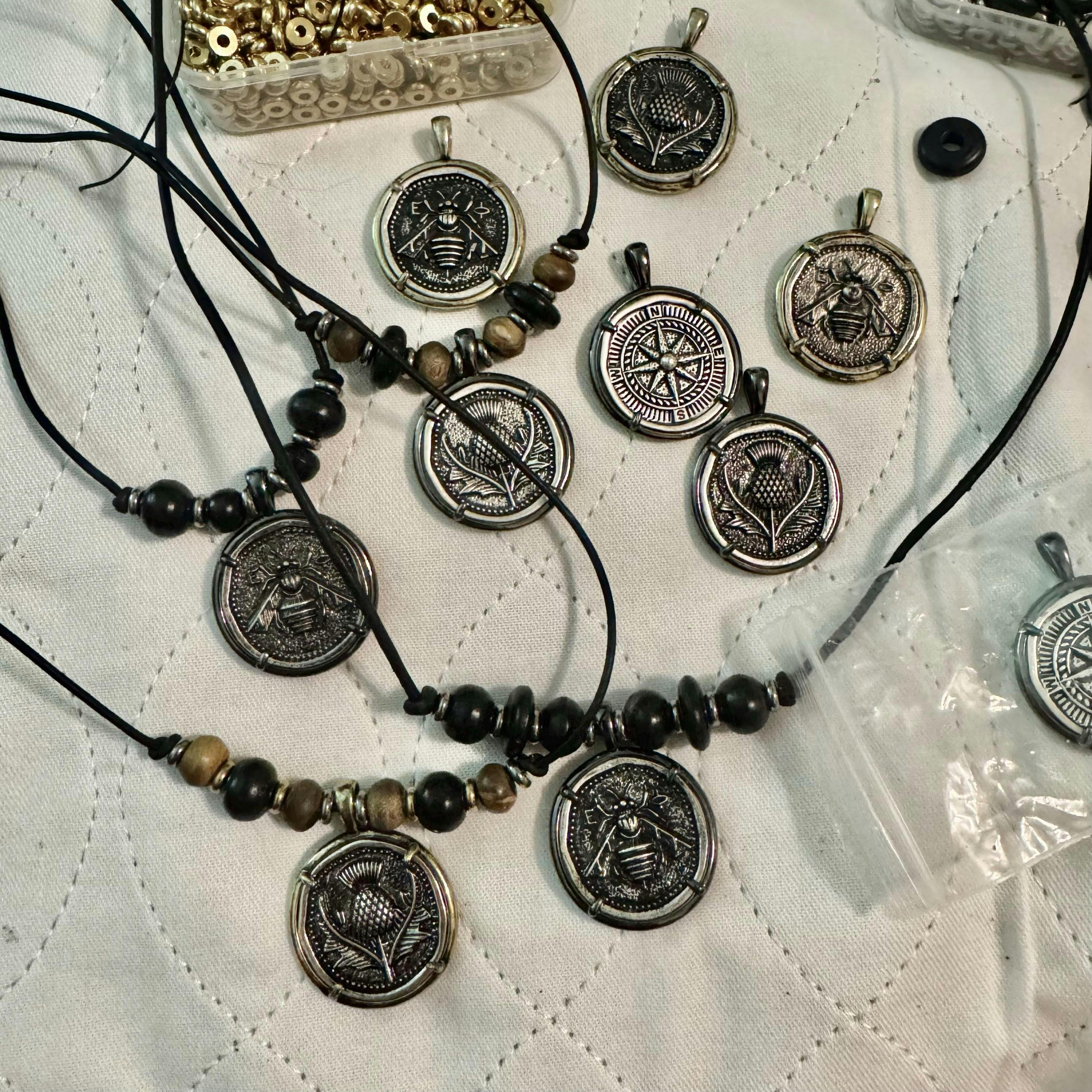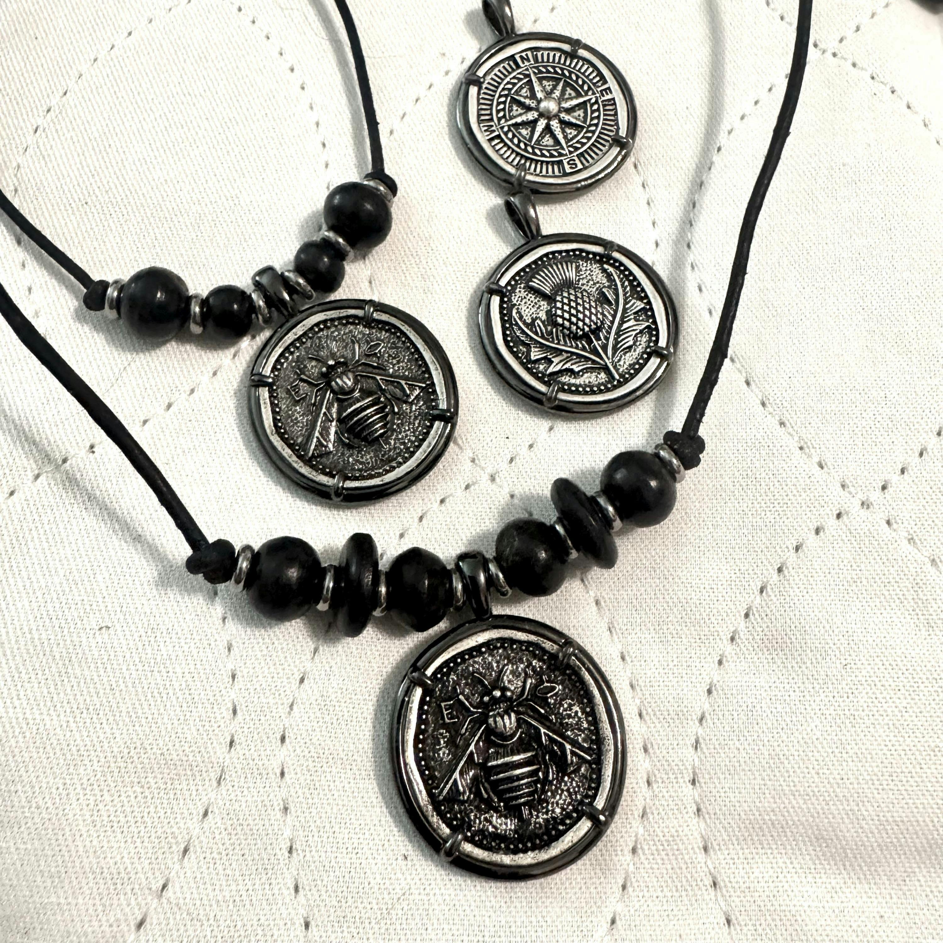 1. Choose from three Ancient Greek Reproduction Coin Pendant styles - compass, thistle, and bee.