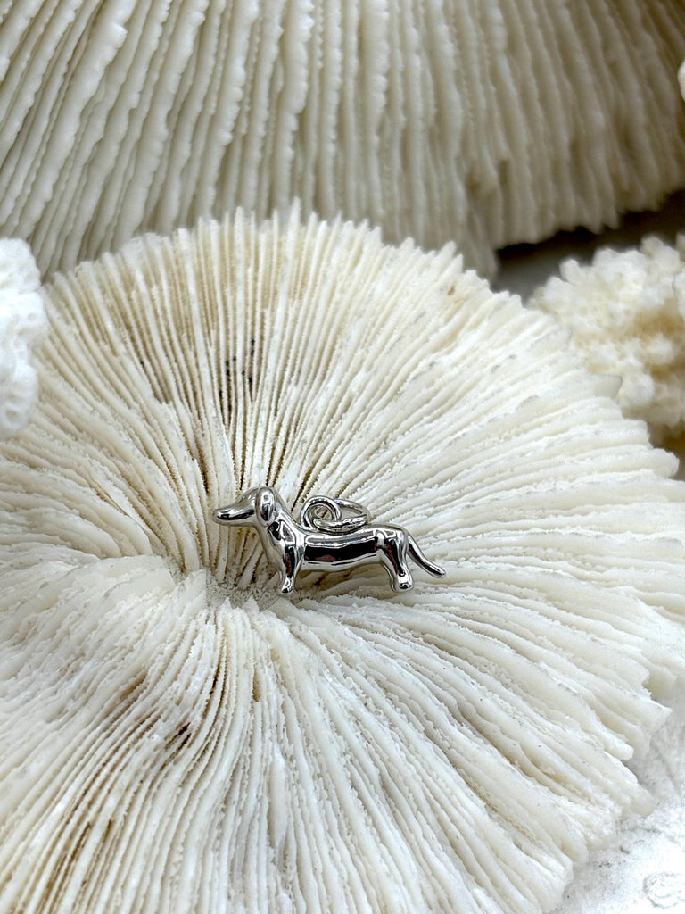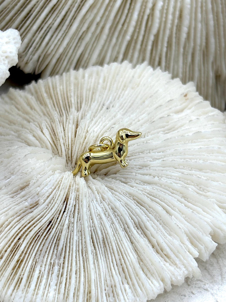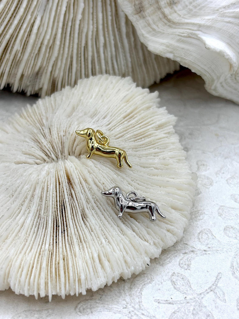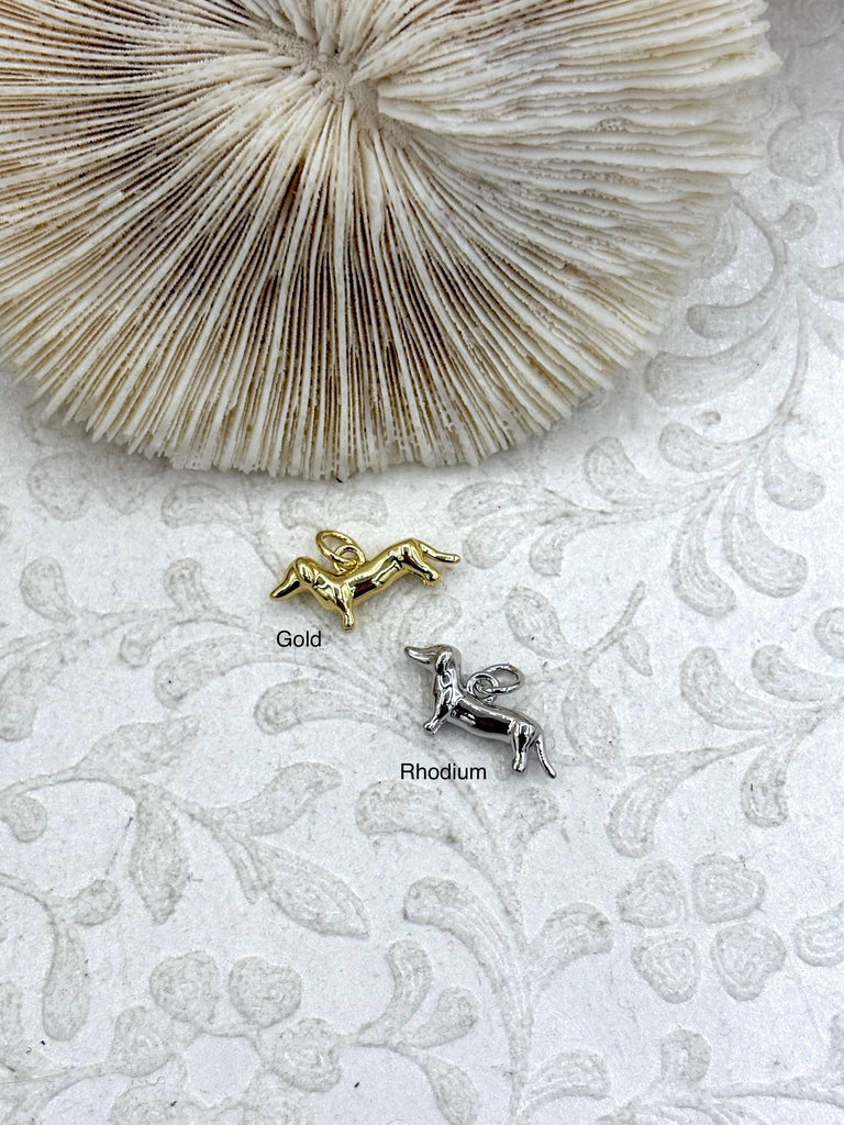 Look no further than this high quality Dachshund Charm! With its dainty design and gold or rhodium finishes, this pendant is sure to add a unique touch to any necklace or other jewelry piece.