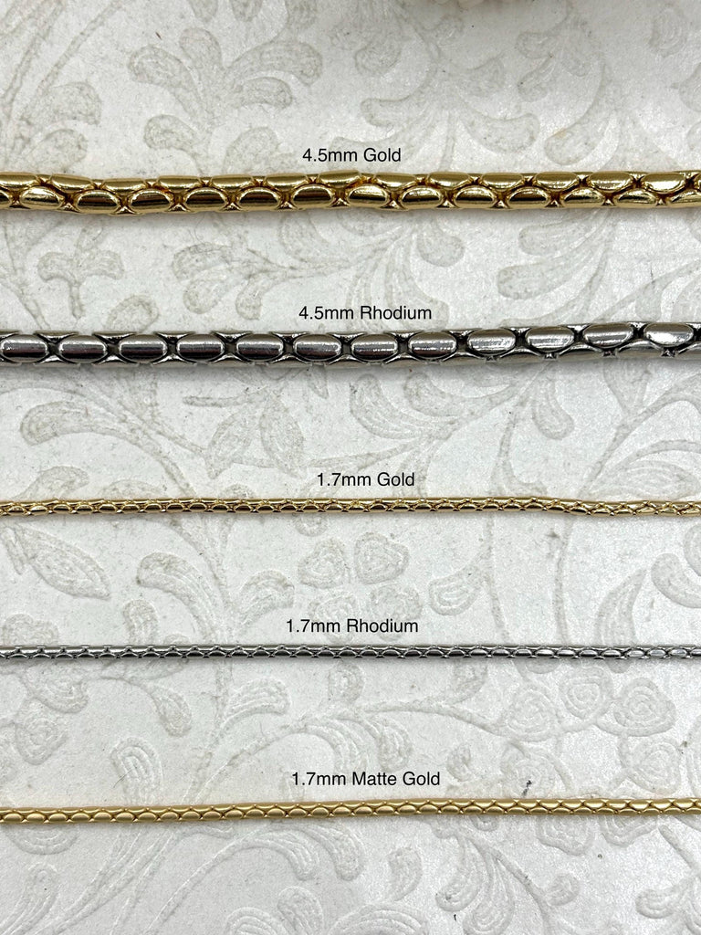 Look no further than these brass snake chains with finished ends! Available in two sizes (4.5mm or 1.7mm), three colors (rhodium, matte gold, or gold), and two lengths (16" or 20"), these chains are perfect for creating a necklace with added jump rings and clasps. Plus, they are lead and nickel safe, so you can feel confident in your purchase. And with fast shipping, orders placed by 11:00 am EST Monday-Friday will ship the same day or next business day.