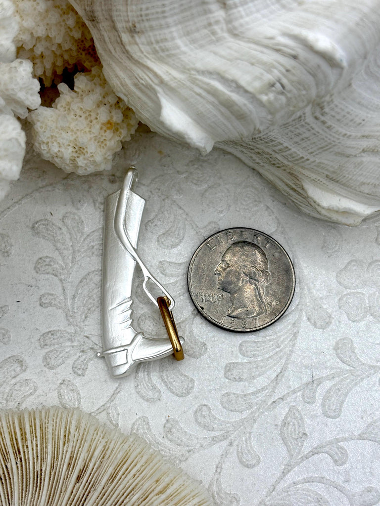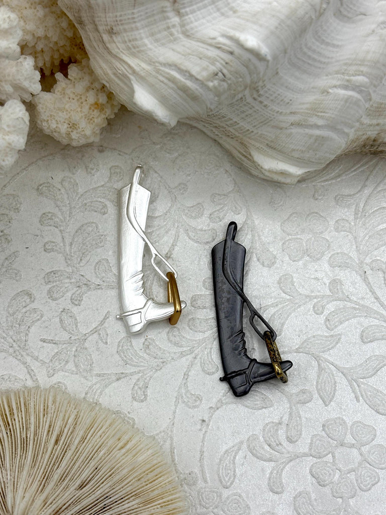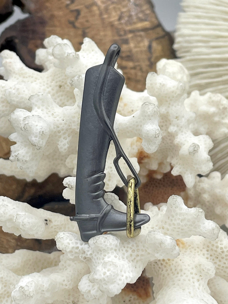 Look no further than our Equestrian Boot and Stirrup Pendant! This stunning pendant features a 42mm x 19mm boot and a 14mm x 9mm stirrup, both made of plated zinc alloy for a durable and stylish look. With 2 different style options, including matte silver with matte gold, and a unique matte gunmetal and bronze combination, there's a perfect match for every equestrian enthusiast.