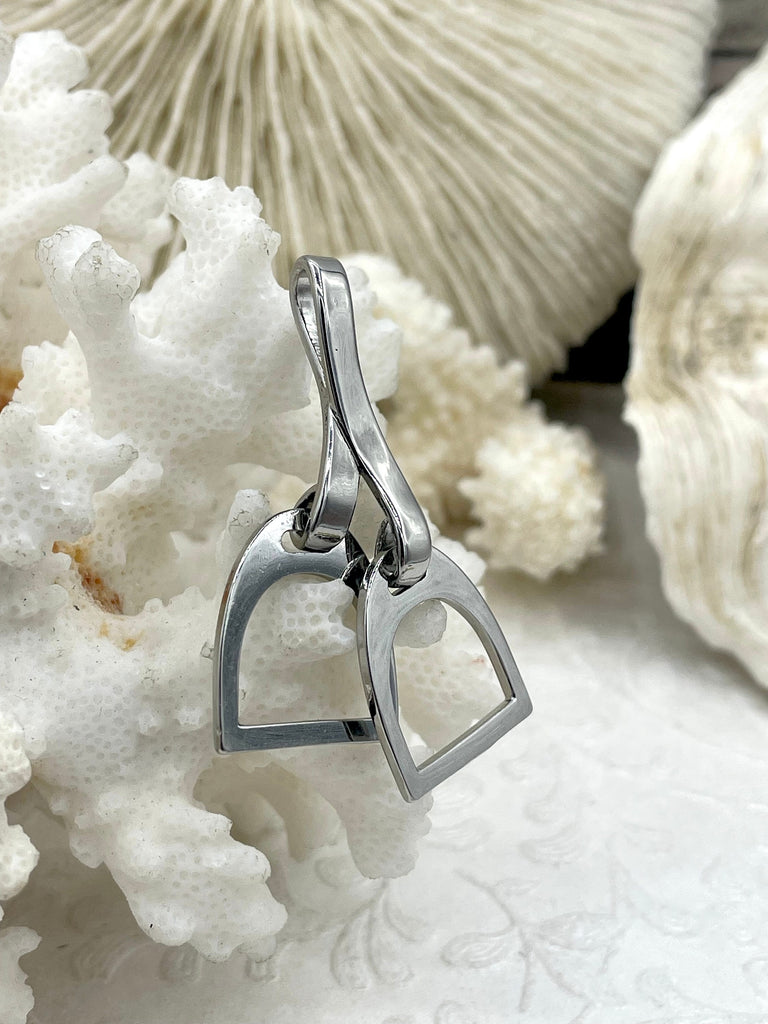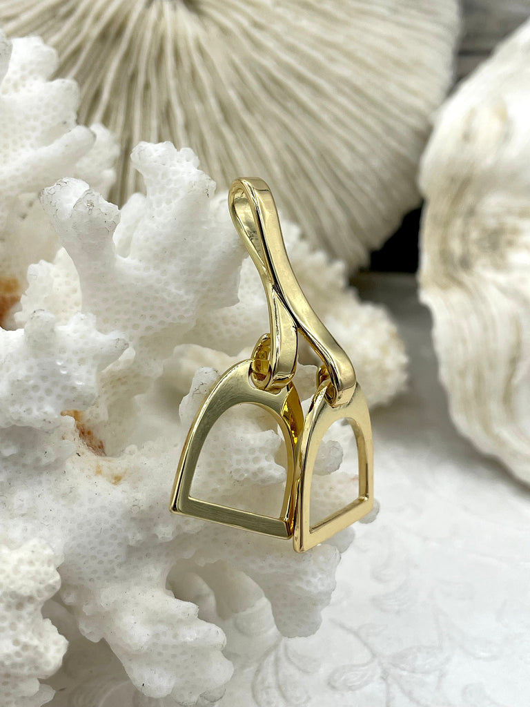 Look no further than our Stirrup Pendants! With 3 stunning finishes to choose from, including matte gold, gold, and silver, this pendant is sure to complement any outfit. Made of plated brass, it is both durable and lightweight. The pendant measures 46mm x 25mm, while the bale is 9.5mm x 3.5mm, making it the perfect size for everyday wear. Plus, with our fast shipping policy, orders placed by 11:00 am EST Monday-Friday will ship the same day or next business day. And don't worry about any potential allergies, as our pendant is lead safe and nickel safe. Enhance your style with our Stirrup Pendant today!
