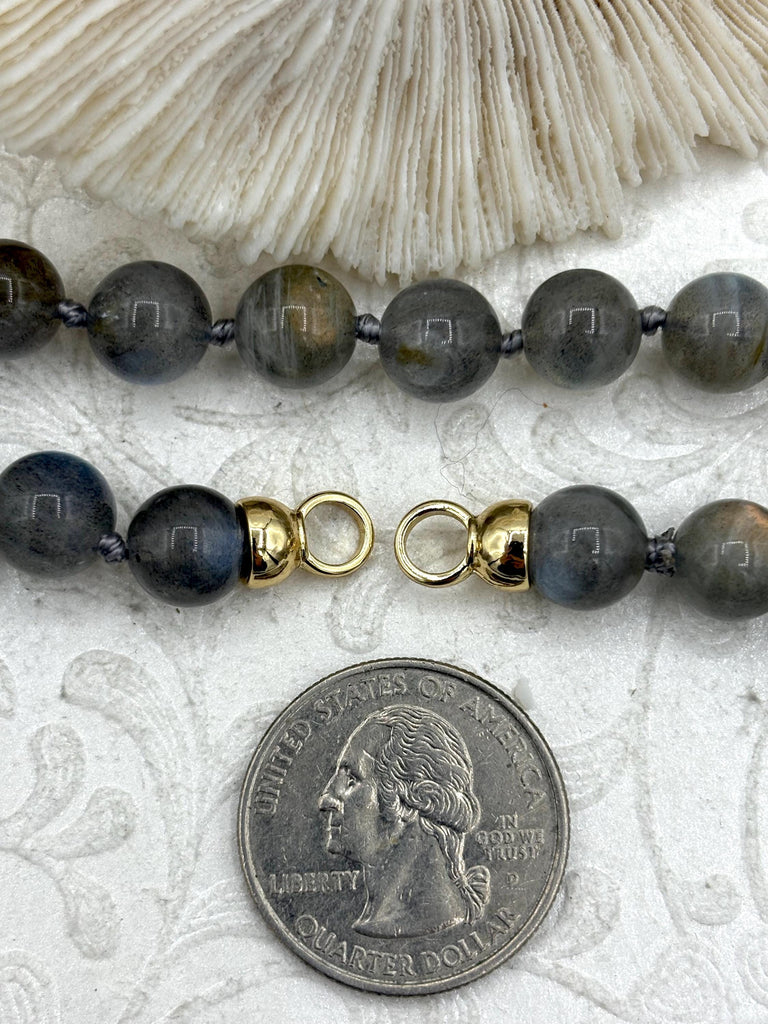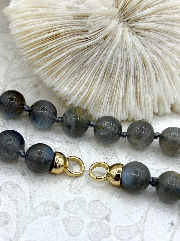 Look no further than this one of a kind Hand Knotted Natural Grey ShimmerStone Necklace. This necklace is crafted with 9mm round Natural Grey ShimmerStone Beads and has closed loop ends so you can add your own clasp. It comes with gold finished ends, and is 16.5 inches long. Made of 9mm Natural Grey ShimmerStone beads, this necklace is lead and nickel safe and ships the same day or next business day if ordered before 11:00 am EST Monday-Friday.
