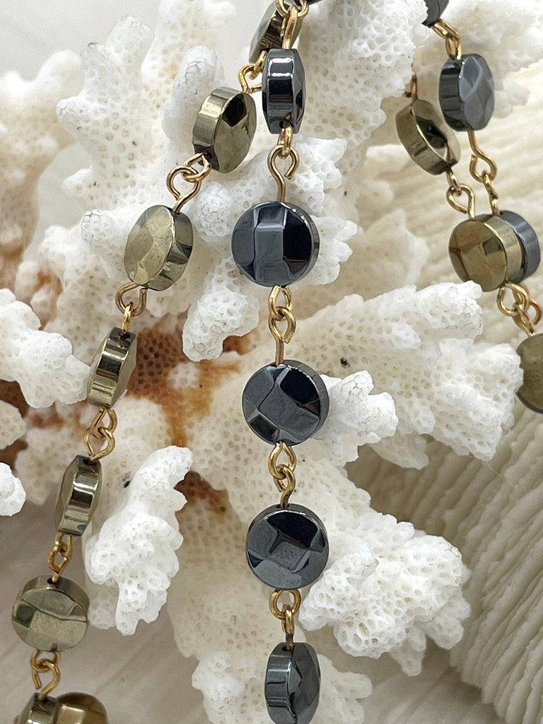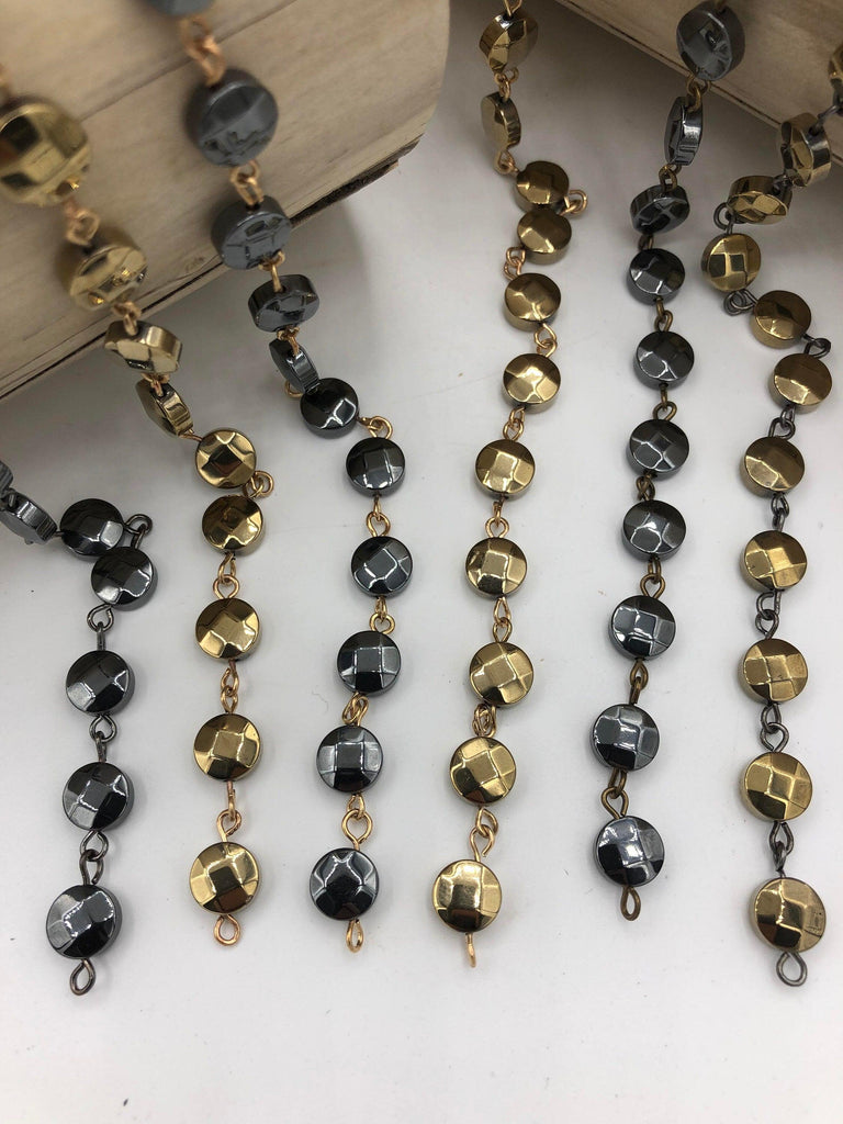 Look no further than the Hematite Rosary Chain! This stylish chain is sold by the meter and is perfect for adding a touch of elegance to any look. It features 8mm faceted coin shape hematite beads and is available in bronze, gunmetal, or gold wire, with black or gold beads. There are 6 styles to choose from to suit any taste. Plus, it is lead and nickel safe and orders placed by 11:00 am EST Monday-Friday will ship the same day or next business day.