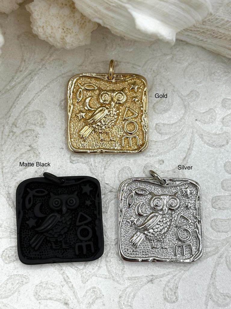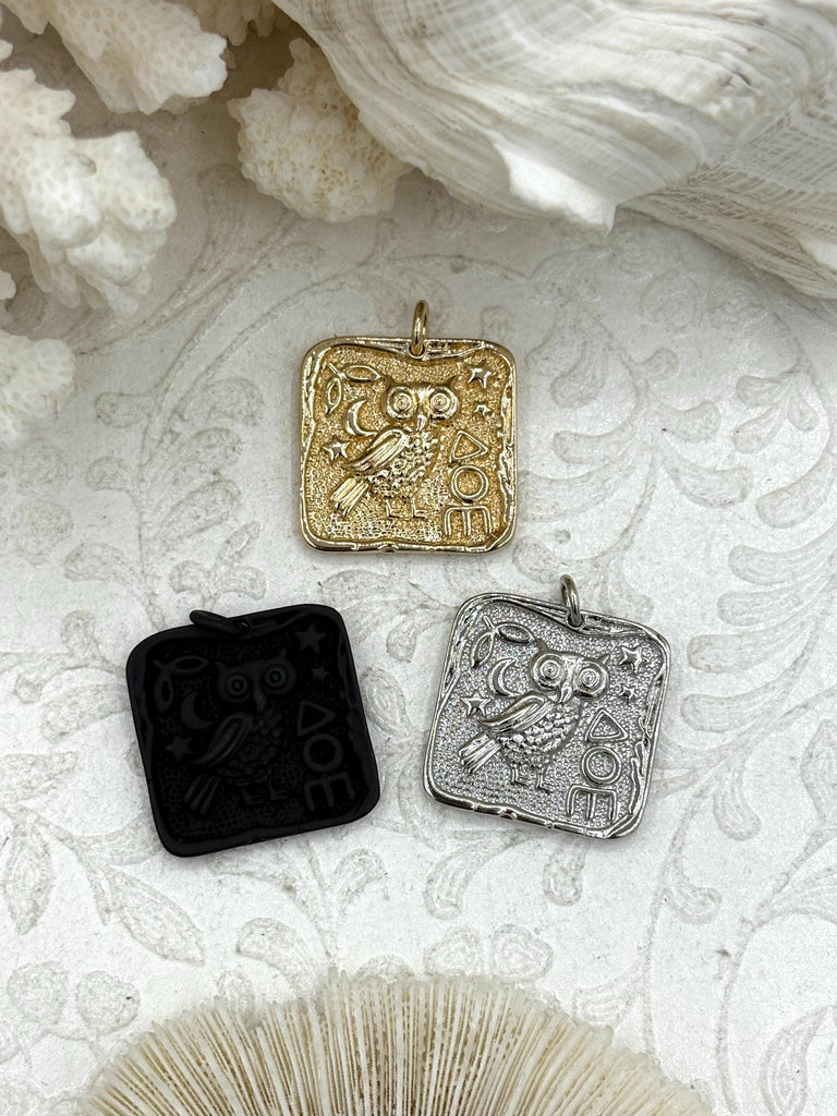 Look no further than our Greek Owl Charms! These charms are made of plated brass and come in 3 finishes: gold, silver and matte black. Each charm measures 24mm, 4.5mm thick, and has a 3.8mm ID jump ring. Plus, our fast shipping policy means that orders placed by 11:00 am EST Monday-Friday will ship the same day or next business day. All of our charms are lead and nickel safe, so you can shop with confidence.