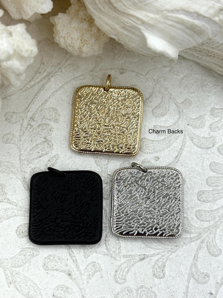 A: Each charm measures 24mm, 4.5mm thick, and has a 3.8mm ID jump ring.