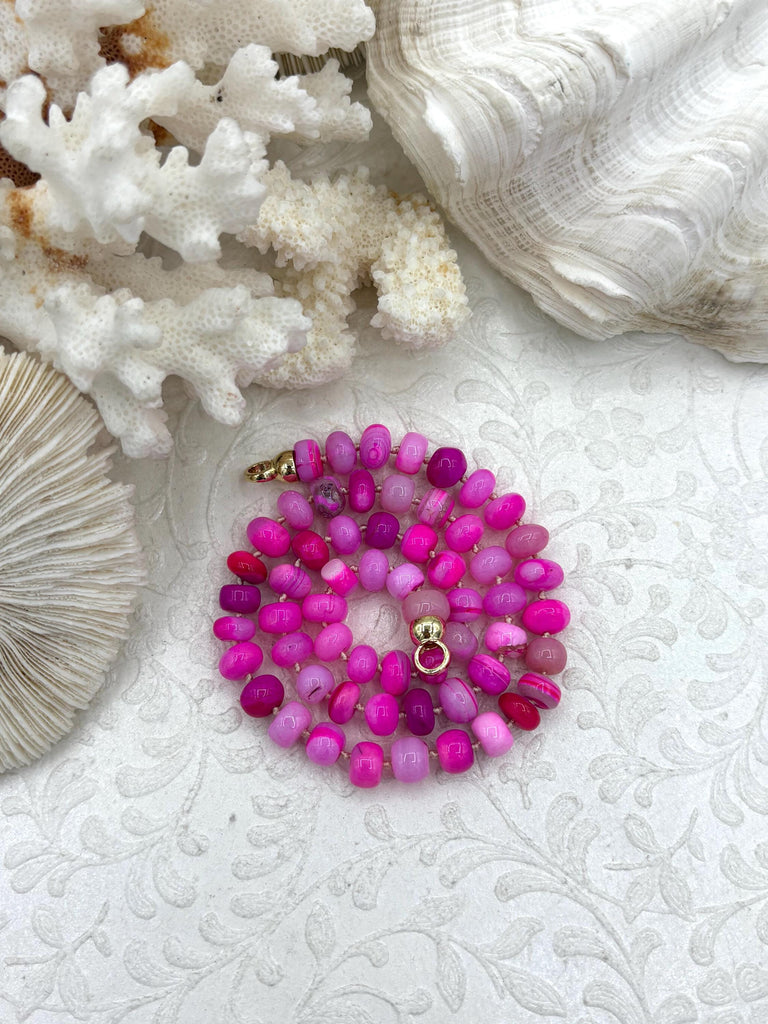 This Hand Knotted Hot Pink Peruvian Opal Necklace is made with genuine Peruvian opals that are hand-knotted and feature gold end caps made of plated brass. The necklace is 17" long and the beads measure approximately 8mm x 5mm.