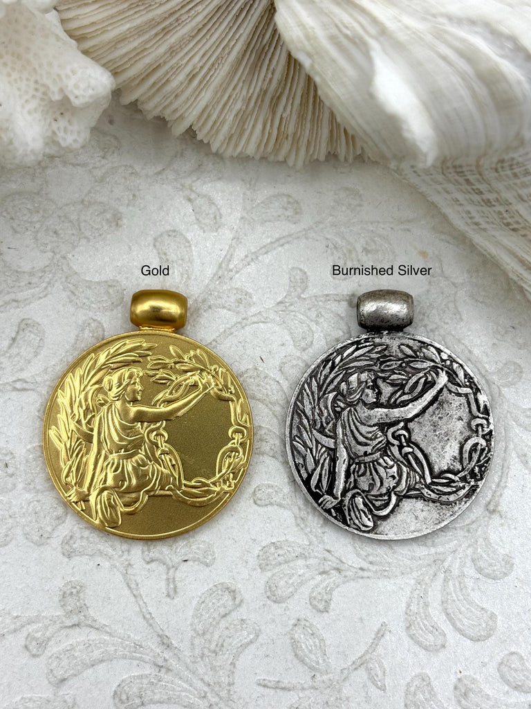 This 30mm pendant is available in gold or burnished silver finishes and is cast from plated brass, making it lead and nickel safe. Plus, orders placed by 11:00 am EST Monday-Friday ship the same day or the next business day.