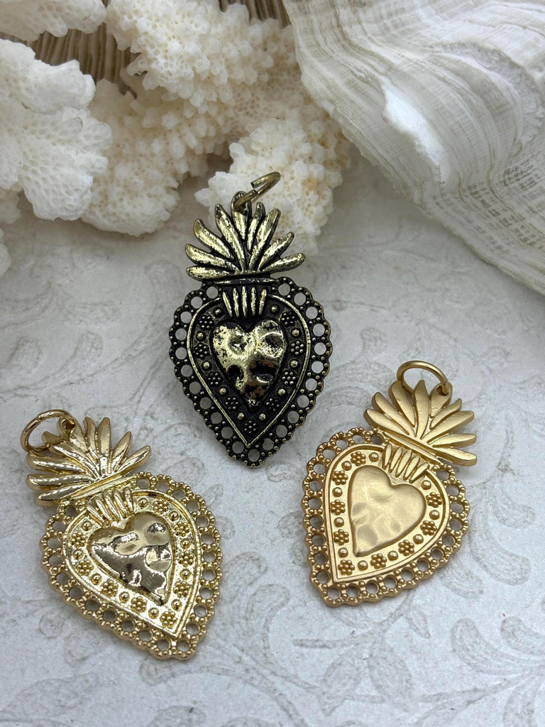 Look no further than our Sacred Heart Charms! These charming heart-shaped charms come in 5 stunning finishes including matte gold, burnished silver, gold, bronze, and silver. Measuring at 40mm x 24mm and 2mm thick, these charms are made of plated zinc alloy, ensuring durability and quality. Plus, with our fast shipping policy, orders placed by 11:00 am EST Monday-Friday will ship the same day or next business day. Worried about safety? Our Zinc Alloy Heart Charms are lead and nickel safe, making them perfect for all your crafting needs.