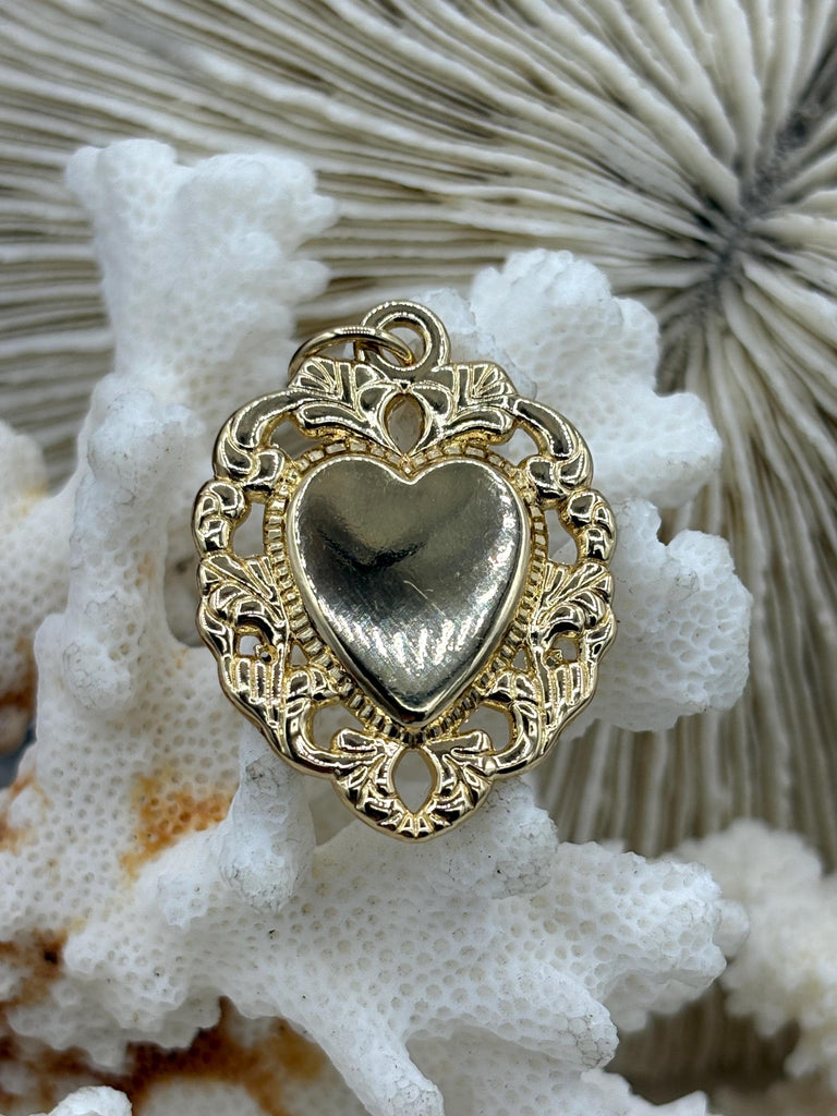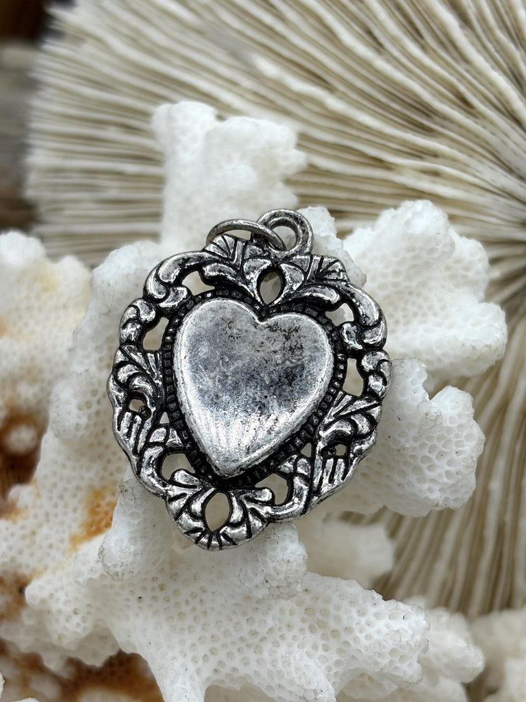 Look no further than our Sacred Heart Charms! These charming heart-shaped charms come in 2 stunning finishes: burnished silver and gold. Measuring at 30mm x 26mm and 2.7mm thick, these charms are made of plated zinc alloy, ensuring durability and quality. Plus, with our fast shipping policy, orders placed by 11:00 am EST Monday-Friday will ship the same day or next business day. Worried about safety? Our Zinc Alloy Heart Charms are lead and nickel safe, making them perfect for all your crafting needs.